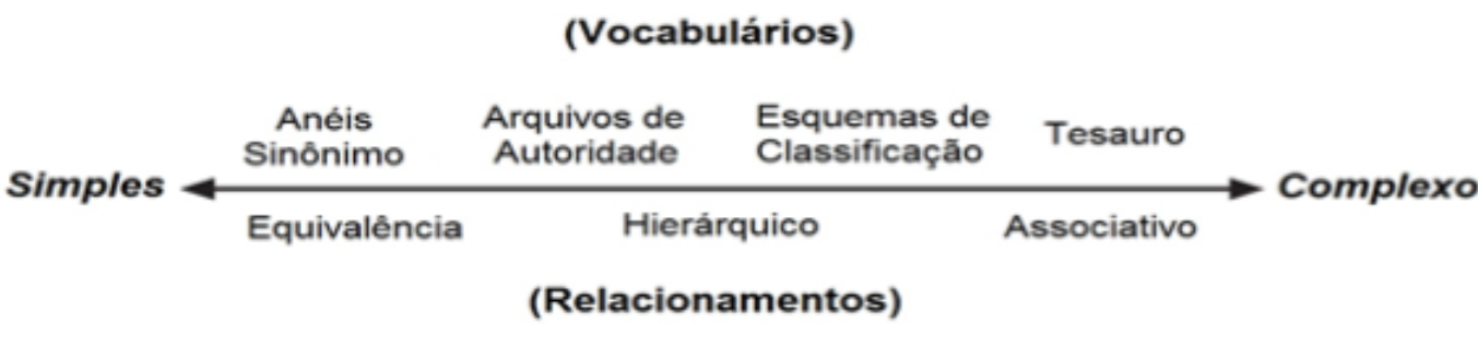 Os vocabulários controlados são instrumentos fundamentais para a organização e representação temática de conteúdos em diversas áreas do conhecimento, esse controle contribui de forma efetiva para o armazenamento e a recuperação das informações em sistemas de recuperação digitais. Garret (2011), destaca os vocabulários controlados como sendo a ferramenta que impõe consistência aos conteúdos digitais. Na construção de um site é preciso falar a linguagem do usuário, definindo os conceitos e as terminologias que serão utilizadas, de modo a facilitar a compreensão da estrutura do ambiente bem como a recuperação eficiente de informações. Os vocabulários controlados são de diferentes tipos, desde os mais simples até os mais complexos, conforme retratado na Figura 1, a seguir: