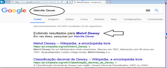 Atualmente, é possível notar que muitos ambientes digitais e websites estão se atentando para o uso destes controles de vocabulário, um exemplo pode ser observado na Figura 2, onde lançou-se, no site de busca Google, o nome pessoal errado Melville Dewei e o site direcionou os resultados da pesquisa para o nome correto que é Melvil Dewey.