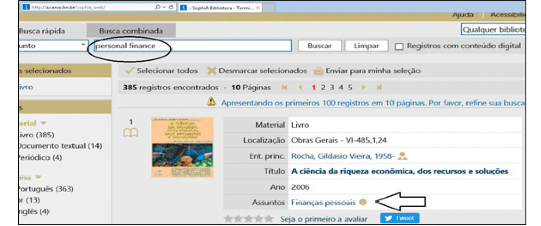Conforme mostra a Figura 3, ao realizar a pesquisa por assunto digitando o termo em inglês personal finance, o sistema da BN recuperou os registros de materiais cuja descrição temática possui o termo Finanças pessoais em português. Para tornar isso possível, as bibliotecas lançam mão dos arquivos para controle de autoridade, onde são estabelecidos os relacionamentos entre os termos.