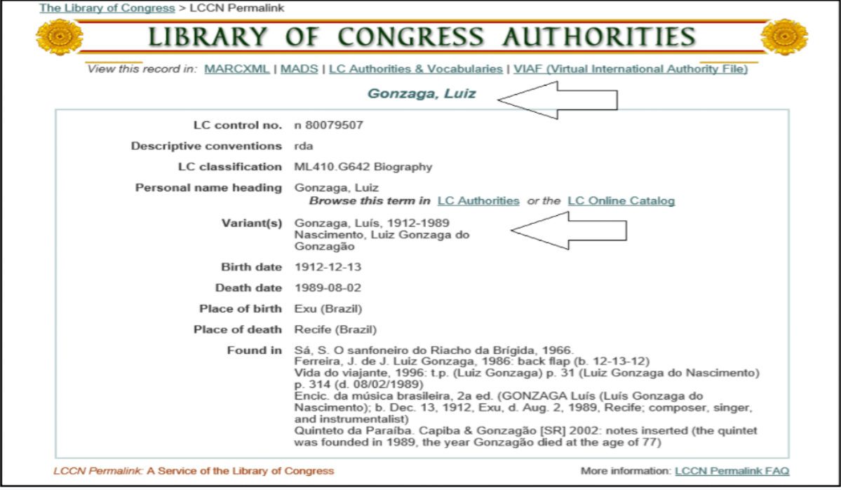 Assim, com os registros de autoridades, a biblioteca escolhe um termo preferido para representar os termos tópicos/assuntos, nomes pessoais, eventos, nomes geográficos e outros. Junto ao termo preferencial, são atreladas as demais variações do nome, através da inclusão de remissivas. Com isso, o usuário poderá realizar a pesquisa digitando diferentes formas de nome e o sistema responderá recuperando todas as variações em uma só busca. Algumas instituições como a Biblioteca Nacional do Brasil e a Library of Congress dos Estados Unidos disponibilizam, para consulta, os seus registros de autoridades em catálogos on-line. A Figura 4, a seguir, mostra como a Library of Congress cadastrou o nome pessoal do músico brasileiro Luiz Gonzaga e as suas variações.