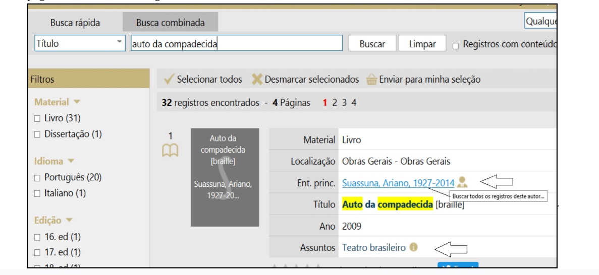 Conforme demonstrado na Figura 5, foi realizada uma busca rápida pelo título digitando-se a expressão Auto da Compadecida no catálogo on-line da BN. O Sistema recuperou 32 (trinta e dois) registros e trouxe uma lista com uma prévia das representações descritiva e temática de cada item encontrado. Logo no primeiro registro, demonstrado na Figura 5, é possível observar dois tipos de autoridades controladas (pontos de acesso), em formato de hiperlink, que são: uma com o nome do autor e datas de nascimento e morte ligadas ao nome: Suassuna, Ariano, 1927-2014; e outra com o assunto temático do material: Teatro brasileiro. Nesse caso, se o usuário desejar, partindo desse registro de livro, ele poderá navegar pelos outros títulos deste mesmo autor no catálogo, para isso, bastaria clicar em cima do nome do autor. Por outro lado, se o usuário desejar ver outros materiais que contemplem o mesmo assunto deste material, bastaria clicar no termo Teatro brasileiro, para ser transportado dentro do catálogo.