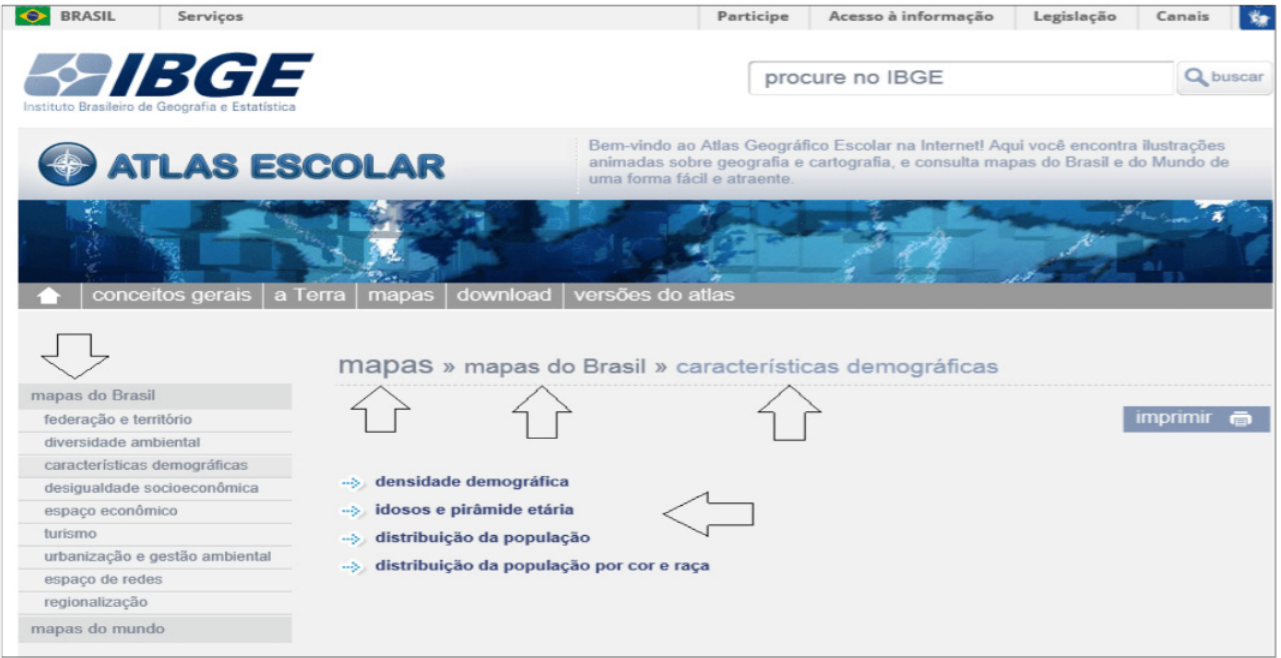 Um exemplo do uso de estruturas com relacionamento hierárquico pode ser observado no site de Atlas Escolar do Instituto Brasileiro de Geografia e Estatística – IBGE. A figura 6, a seguir, mostra que o IBGE classificou e organizou os mapas do Brasil e do mundo em diferentes tipos de categorias hierarquizadas no website.