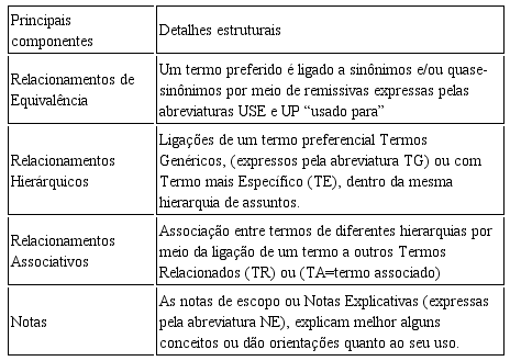 De acordo com Lima e Maculan (2017, p. 65), “as relações semânticas estabelecidas em um tesauro são, basicamente: (a) hierárquicas (gênero-espécie; todo-parte); (b) de equivalência (sinônimos); (c) associativas (ligações semânticas)”. Além dos relacionamentos semânticos, os termos de um tesauro podem conter notas explicativas com informações sobre o significado do termo, sobre a data da criação do termo, instruções para indexadores e outras (UNESCO, 1993, p. 31). No Quadro 2, a seguir, foram listados os principais componentes da estrutura dos termos de um tesauro:
