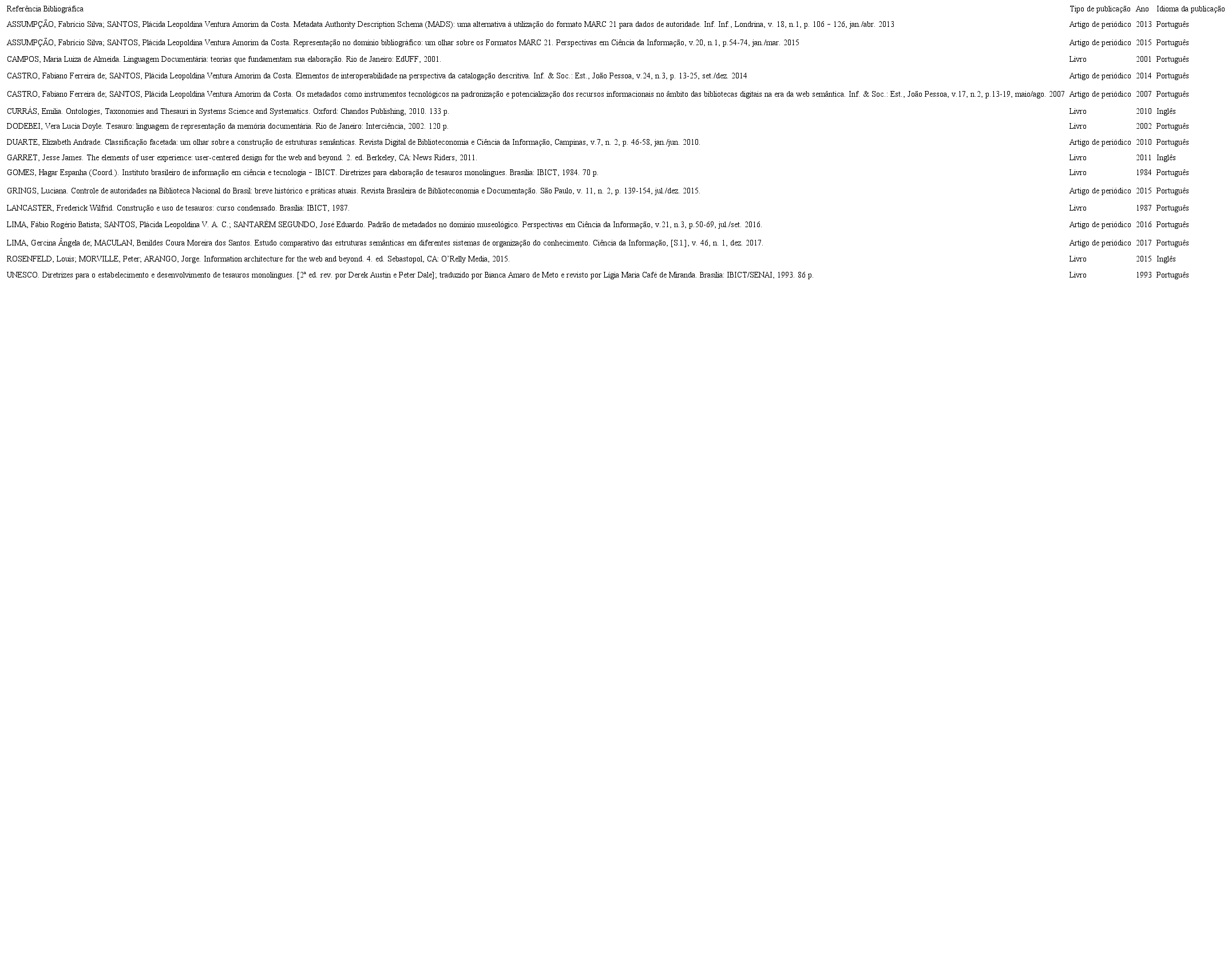Quanto às fontes, o presente estudo revela-se um estudo bibliográfico partindo da visão de Rosenfeld, Morville e Arango (2015) acerca das características de três estruturas de representação da informação e sua utilização em websites, sendo: a) os vocabulários controlados; b) os tesauros, criados a partir dos esquemas de classificação hierárquicos e facetados; e c) os metadados, utilizados tanto para representação temática como também para a descritiva. Nessa perspectiva, foram consultadas bibliografias das áreas de CI e AI, nacionais e estrangeiras conforme o Quadro 1, a seguir: