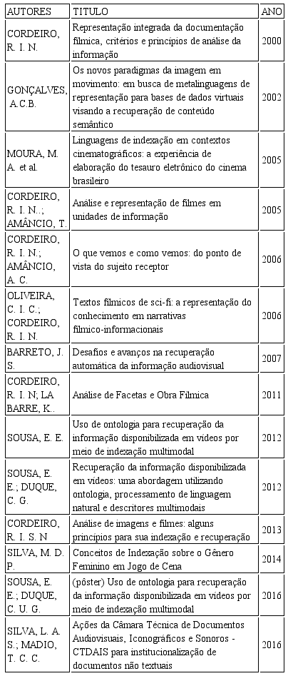 A coleta e tabulação de dados foram realizadas no primeiro semestre de 2017 e privilegiou-se o período de 2000 a 2016 para a coleta dos dados. Os termos utilizados para as buscas foram: análise de filmes de ficção, análise fílmica, análise de conteúdo fílmico, indexação de filmes, indexação de audiovisual, indexação de imagens em movimento, imagem em movimento, representação documentária de filmes de ficção, unidades de informação com imagem em movimento, acervos de filmes, texto fílmico.