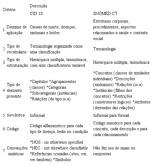 Compreender uma terminologia envolve levantar suas principais características. O quadro 1 resume critérios de comparação definidos aqui para a CID 10 e para a SNOMED CT.