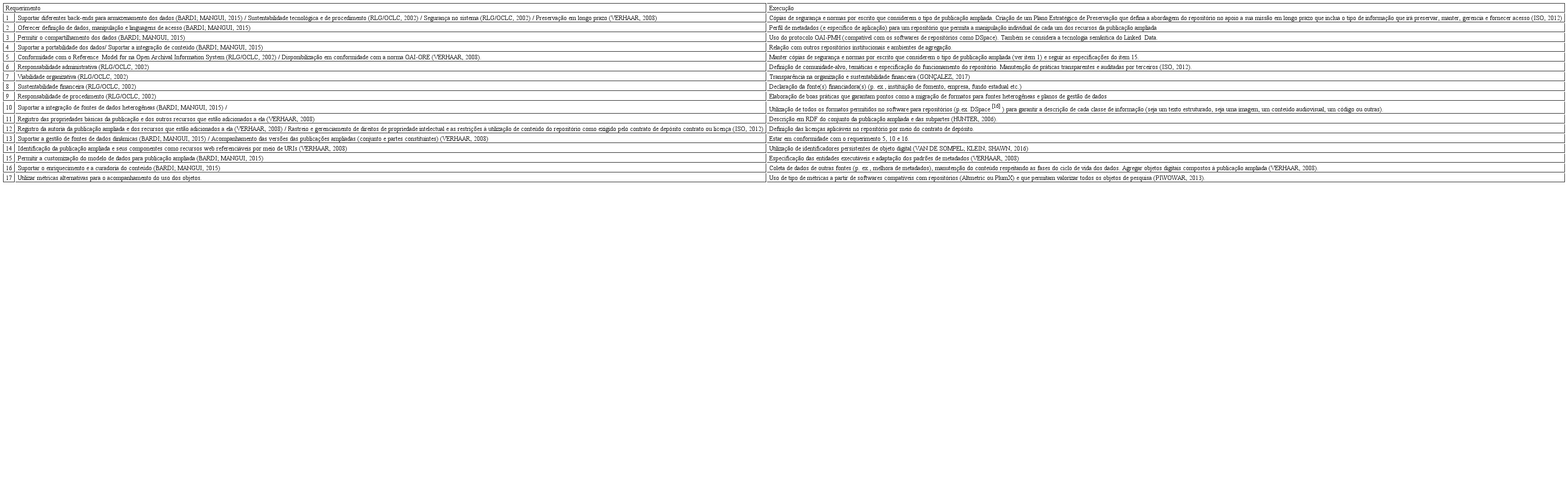Como exposto na seção 5, em 2002, RLG e OCLC enumeraram uma série de atributos que caracterizam a um repositório digital confiável. Por sua vez, Bardi e Mangui (2015) detalharam os requerimentos de um sistema de gestão para publicações ampliadas (Enhanced Publication Management Systems - EPMS) e Verhaar (2008) destaca dez especificações estruturais para publicações ampliadas. A combinação dos grupos de requerimentos com as indicações da norma ISO 16363:2012 garantirá o trabalho com publicações ampliadas dentro de repositórios digitais confiáveis. No Quadro 1, detalham-se os requerimentos e as formas de execução.