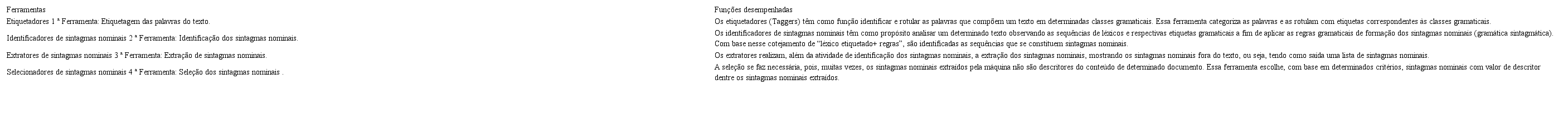 Para que ocorra a indexação automática por sintagmas nominais, são necessárias ferramentas ou softwares que permitam a realização desta atividade. A seguir verificam-se, por meio do Quadro 1, as ferramentas necessárias à execução da indexação automática por sintagmas nominais: Etiquetadores; Identificadores de sintagmas nominais; Extratores de sintagmas nominais; e Selecionadores de sintagmas nominais.