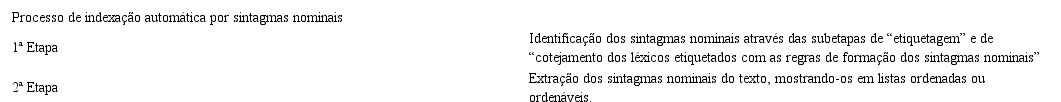 Com base no que foi visto até o momento, pode-se estruturar o processo de indexação por meio de sintagmas nominais em três etapas gerais, as quais são expostas no Quadro 2. Na primeira etapa é feita a identificação dos SNs, por meio da etiquetagem das palavras isoladas e em seguida do confronto dessas palavras com o conjunto de regras de formação de SNs. Após essa primeira etapa é efetuada a extração dos SNs, essa segunda etapa consiste em mostrar os SNs de forma destacada no texto ou como um arquivo separado. Finalizando, é efetuada a seleção dos SNs extraídos, identificando os que são mais descritivos do conteúdo do documento do qual foram extraídos.