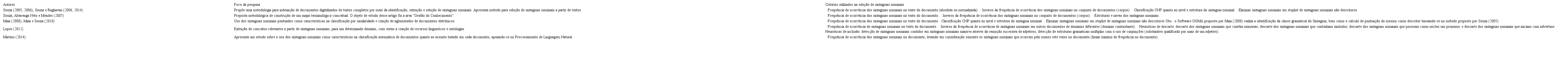 sintetizar e classificar os critérios de seleção de sintagmas nominais utilizados para selecionar os sintagmas nominais com valor de descritor dos documentos.