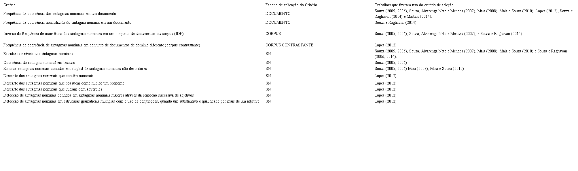 Quanto ao escopo dos critérios de seleção de sintagmas nominais, percebe-se que a maioria dos critérios se baseia em características inerentes aos sintagmas nominais, seja quanto ao nível do sintagma nominal, a estrutura gramatical do mesmo, ou o conteúdo léxico em termos de expressões presentes em stoplist. Levando em conta a frequência de adoção em metodologias de seleção de sintagmas nominas, ganham destaque os critérios baseados no conteúdo do documento e conteúdo do corpus, sendo tal conteúdo representado em termos de frequência de ocorrência de cada sintagma nominal em cada documento e no conjunto de documentos respectivamente.