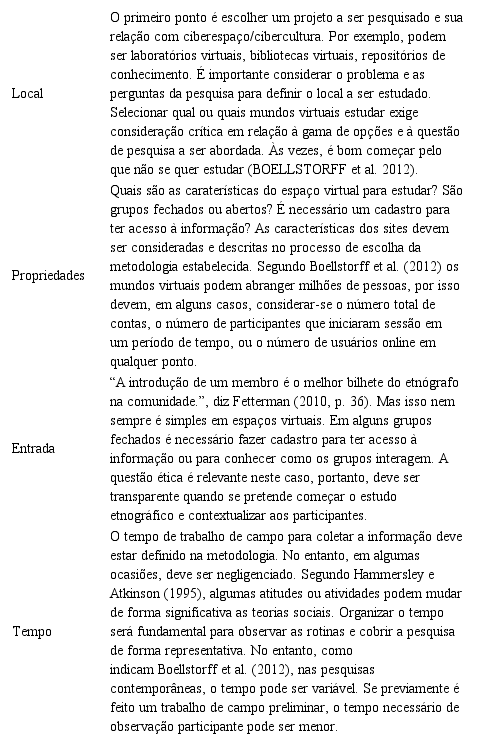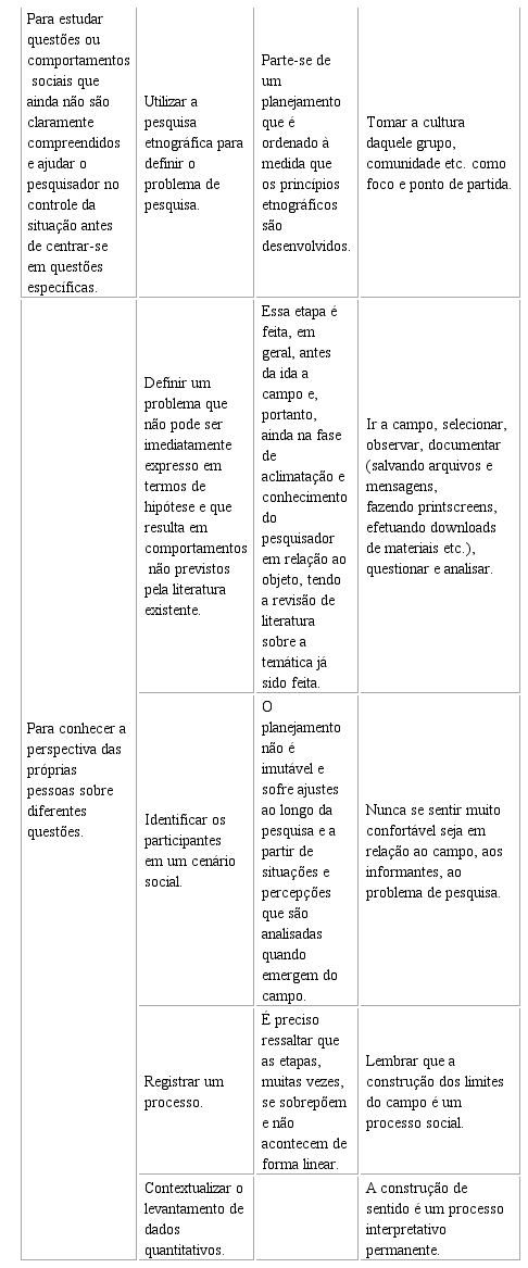 Do mesmo modo, Hine (2000, 65) sinaliza que “[...] toda forma de interação é etnograficamente válida [...]”, portanto, deveria ser uma só etnografia com diferenças em suas aplicações e em dependência do objeto e problema de estudo. O uso da etnografia para internet pode ser válido, mas os preceitos e premissas são as mesmas da etnografia. Fragoso, Recurso e Amaral (2013) optam pelo método etnográfico, considerando a internet como objeto de estudo e como abordagem teórica e empírica.