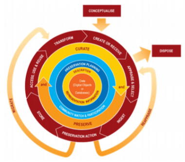 O Digital Curation Centre (DCC), centro de estudos de referência internacional, propõe um modelo de ciclo de vida de curadoria digital, conforme exposto na Figura 1, que oferece um conjunto de ações que levam em consideração todas as instâncias que relacionam-se com a manutenção do valor informacional de um recurso digital.