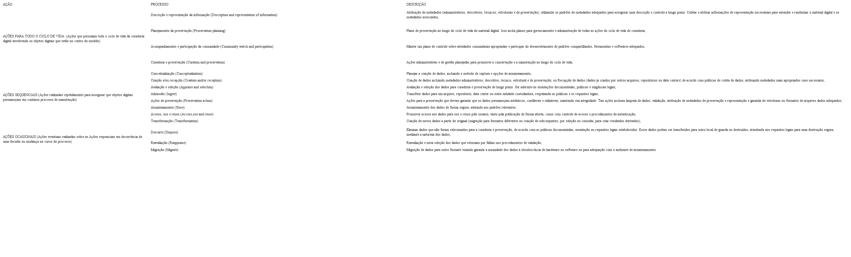 As ações que compõem o Modelo de Ciclo de Vida de Curadoria Digital do DCC são divididas em Ações para Todo o Ciclo de Vida; Ações Sequenciais; e Ações Ocasionais, para abranger as necessidades de gestão do material digital. Com base no estudo de Higgins (2008) apresentam-se as ações e a descrição dos seus respectivos processos no quadro 1.