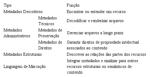 Os metadados podem ser distinguidos por suas funções. O quadro 2 sintetiza uma possível divisão, segundo a publicação da National Information Standards Organization (NISO), em 2017.