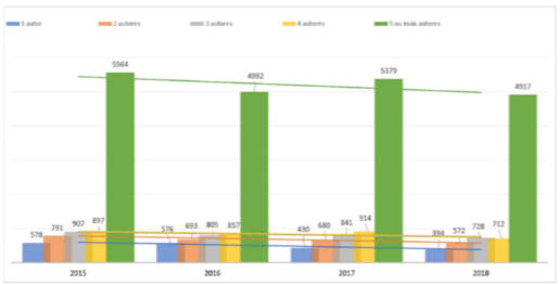 Nota-se que, em todos os anos, cinco ou mais autores é a categoria que mais se sobressai, possuindo mais publicações do que todas as outras categorias juntas. No total, verifica-se que 64,7% das publicações possuem cinco ou mais autores, enquanto, para as demais categorias, os números são: quatro autores: 10,4%; três autores: 10,1%; dois autores: 8,4%; e um autor: 6,1%. Outra observação importante é que todas as categorias apresentaram, em algum grau, queda, fruto da redução no quantitativo total de publicações. De todo modo, a redução mais latente é a dos artigos em autoria única, que, se mantiverem este ritmo, tendem a se aproximar, em breve, do desaparecimento. Derek de Solla Price (1976), um dos autores mais importantes e fundantes do campo cientométrico, percebeu em seus estudos o crescimento vertiginoso na proporção de artigos com autoria múltipla, chegando a prever que, se fosse mantido este padrão, por volta de 1980, os artigos com autoria única iriam desaparecer (PRICE, 1976, p. 55). Apesar de tal visão não se ter confirmado, se sabe que na ciência contemporânea, em especial, nos campos que se desenvolvem em torno de laboratórios, como é o caso da área de Saúde, a coautoria apresenta um espaço amplo para contínuo crescimento, enquanto a autoria única tende a se enfraquecer.