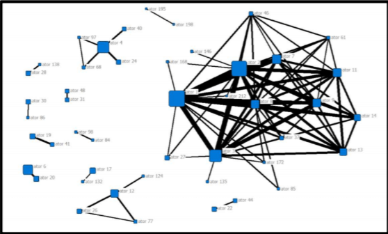 Pressupondo que os autores mais representativos podem expressar elementos importantes do campo das DTN, elaboraram-se as redes. A Figura 3 expressa as relações autor-autor e as constelações que se formaram a partir desta variável. Neste grafo, foram excluídos os isolados com o propósito de enfatizar os vínculos. Como está presente nas redes de colaboração um ranking de quantidade de publicações, que representa de modo superior os indivíduos que produziram mais, inferiorizando os que menos produziram, optou-se por não apresentar o nome dos atores envolvidos, tendo em vista que o objetivo do trabalho não é a simples classificação de pesquisadores por produtividade. Como o ângulo de análise enfoca questões de natureza relacional, os rótulos dos dados têm sua importância, aqui, pormenorizadas, assim, escolheu-se classificar os atores de 1 a 274, conforme o ordenamento decrescente do ranking, e utilizar o número de colocação precedido da expressão “ator” no rótulo dos nós.