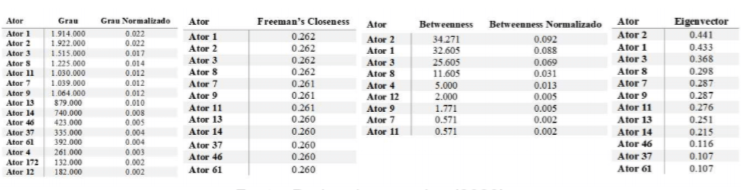 Para aperfeiçoar a análise selecionaram-se quatro métricas de centralidade para aplicação: (a) Freeman’s degree, (b) Closenesse (c) Betweenness, similarmente ao trabalho de Hossain, Wu e Chung (2006); e d) Eigenvector. Estas quatro, conforme previamente informado, consideraram os 274 pesquisadores mais representativos do universo expandido.