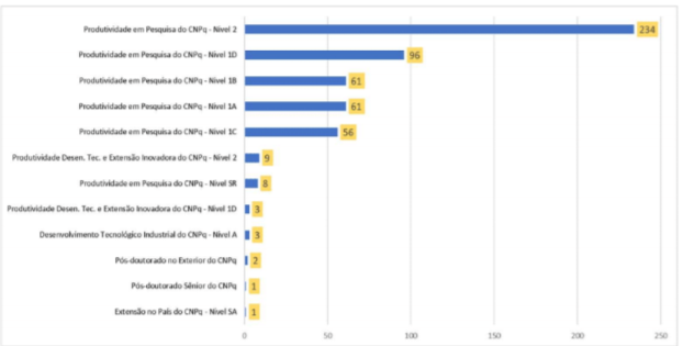 Ao se observarem os dados do universo simples, definido inicialmente como grupo representativo do campo das DTN no Brasil, visualizaram-se 535 (19,6%) bolsistas do CNPq. Chama a atenção que, dentre os 50 pesquisadores com maior author rank, 41 são bolsistas do CNPq. As modalidades de bolsas identificadas foram as seguintes: