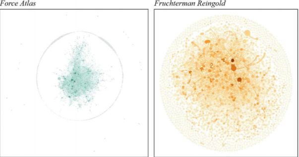 O primeiro se destaca pela simplicidade e facilidade de leitura de redes que proporciona. Sua representação visual gráfica permite realizar análise exploratória de comunidades de autores, representando tamanho, densidade, nós conectados e isolados (FIALLOS et al., 2017). Acrescenta-se sua facilidade de uso, por estar implementado no Gephi®, e a possibilidade de trabalhar com atributos dos atores da rede. O segundo é mais bem aplicado a dados em que a conectividade entre nós é relativamente livre, indicando uma relação importante entre as entidades. Tende a colocar os hubs (nós altamente conectados) no meio da camada, enquanto, na geometria, todos os pontos são conectados, e o layout tende a unir os nós conectados por similaridade (PAVLOPOULOS et al., 2010).