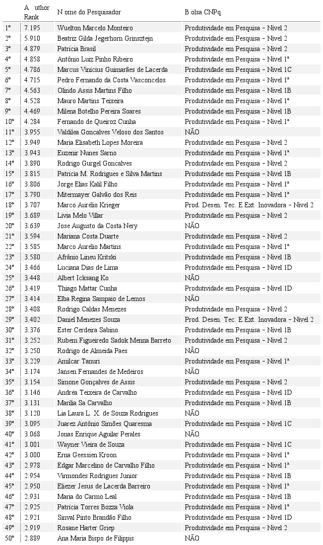 A propósito, dentre os 50 mais produtivos no quesito “produção bibliográfica”, 44 (88%) são bolsistas do CNPq. Martelli-Junior et al. (2010) já haviam destacado a importância das bolsas de produtividade do CNPq para a área de Medicina, como mecanismo indutor que promove uma competição entre os pares, incentivando tanto a formação de novos pesquisadores como a publicação de artigos em periódicos de impacto.