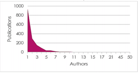 More than 3300 authors signed gender study papers published until 2017 indexed at WoS. Each publication has an average of 2.26 authors, with a median and mode equal to 1 author. The single authorship is prevalent and makes up 57.44% of the cases (934 publications). The largest part of publications concentrates in a small number of authors, which is common for the areas of humanities and social sciences (see graphic 1) – 75.58% have one or two authors, almost 85% have up until 3 authors (84.93%) and 9 in each 10 publications have up until 4 authors (90.71%). The outliers are two publications, with 50 and 48 authors.