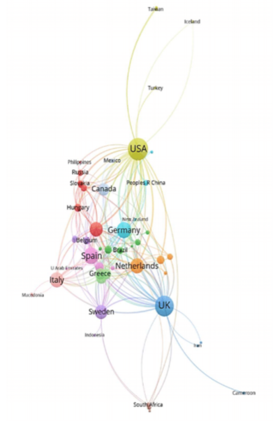 There is no center in the map and many countries have similar weight and collaboration with others. The USA and United Kingdom have the higher number of collaborations. The USA is strongly linked to countries from diverse clusters and also to countries isolated from the others (Turkey, Taiwan, Iceland, South Korea and Japan, belonging to the yellow cluster). United Kingdom is also strongly linked to countries from diverse groups and to isolated countries (Jamaica, Cameroon, Iran and Botswana, all from the light blue cluster).