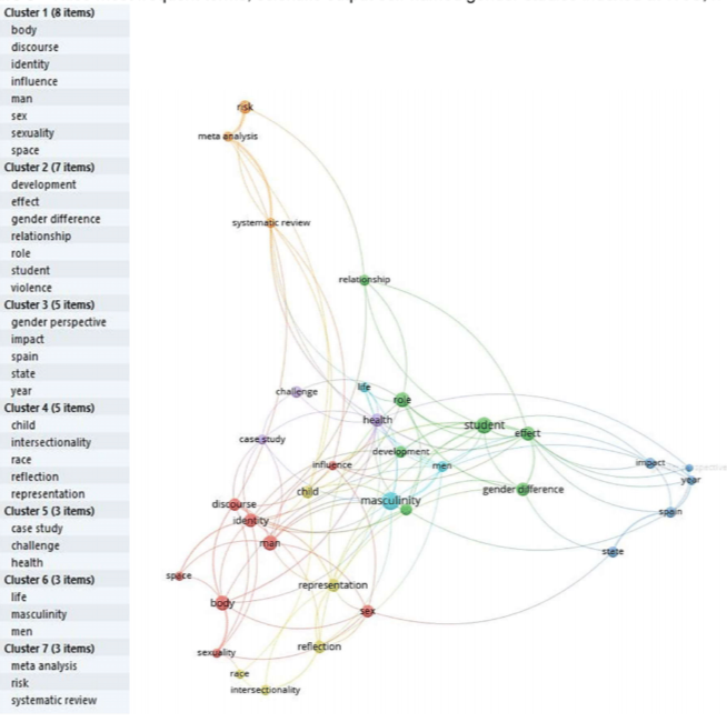 Both analyzing the development of authors’ keywords thought the years and the total occurrence of the terms (whole data with all the years), it seems that gender studies subjects are also following the feminist movement concerns. The feminist movement guidelines, if seen from the waves analogy, developed from the demands for political rights (the first wave of the feminist movement), for equal rights, including the private sphere (second wave), and lastly, the questioning of micropolitical approaches and even femininity itself (third wave), according to Freedman (2003). The data suggests that gender studies researches are also directed towards questioning interpersonal relations, in public and private sphere, encompassing more frequently the reflections about the gender considered “oppressor” and “omnipresent” in the studies. Do researches tend to turn to a post-structuralism view, in which it seems necessary to reflect about the devices once considered consolidated, like masculinity? Other terms seen at cluster 1 in figure 5 (the red cluster) seem to answer yes to these questions, as “discourse”, “body”, “sexuality”, “identity” and “space”.