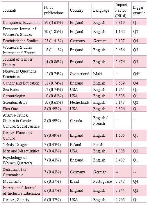 Among the 20 sources with higher number of publications, there are journals from all the quartiles of the Journal Citation Reports (CLARIVATE ANALYTICS, 2017d), in different research areas, such as Computer Sciences, Education, Women’s Studies, Gerontology and Literature. One of the journals is no longer indexed by WoS (Nouvelles Questions Feministes, from Switzerland), one is stemming from the newer WoS index, the Emerging Sources Citation Index (Atlantis-Critical Studies in Gender Culture; Social Justice, from Canada) and three do not have Impact Factor (beyond Atlantis, the Teksty Drugie and Zeitschrift Fur Germanistik, Polish and German journals, respectively). All this demonstrates that self-named gender studies indexed at WoS are published in spread journals with different characteristics, demonstrating its interdisciplinarity.