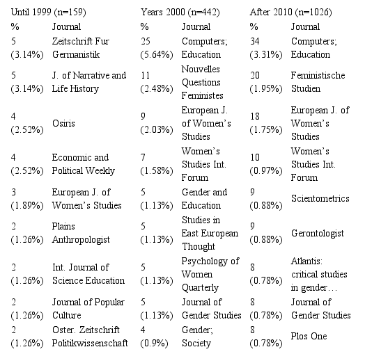 If compared, the evolution from the journals with the largest number of papers through time, it shows: (1) the dispersion of the publications in many journals is constant through time, occurring in all three periods of analysis; (2) up to 1999, the main publications are in the areas of sociology, anthropology and education, only one journal among them has its main focus on gender studies (European Journal of Women Studies); (3) from 2000 to 2010, journals whose main focus is gender studies are more frequent (not only among the main journals, but also on the list in general); (4) starting in 2010 the number of gender studies journals grows and gender studies also begin being published in multidisciplinary vehicles and in other areas of knowledge, which demonstrates the consolidation of the area and the recognition from other areas.