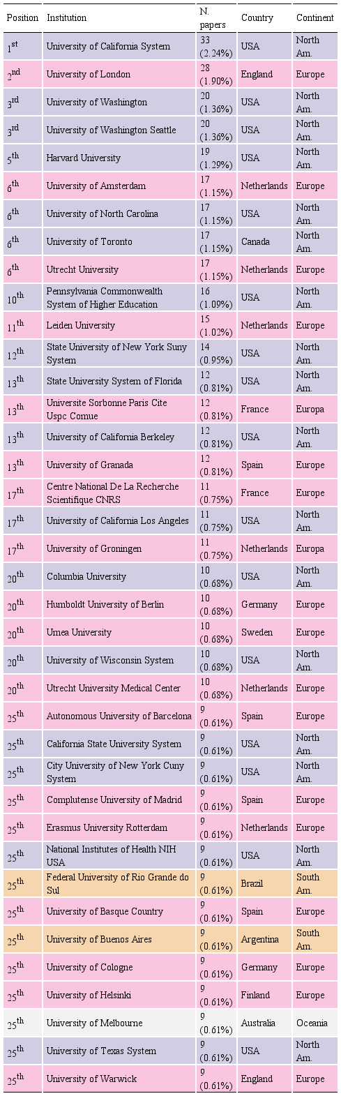 European and North American institutions are the only ones to appear among the 24 institutions with higher number of publications. Two institutions from Latin America (Federal University of Rio Grande do Sul and University of Buenos Aires) and one from Oceania (University of Melbourne) appear in the 25thproductivity position of self-named gender studies publications, position shared with ten more institutions from USA and Europe.