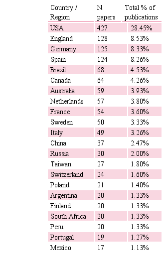 Brazil shows up in 5th position in the general ranking, also being represented in the institutions with a higher publication volume table by the Federal University of Rio Grande do Sul (Universidade Federal do Rio Grande do Sul, UFRGS). It is, along with Argentina and Australia, the country with higher production outside the North America/Europe axis (regions historically more traditional in scientific research). Argentina and Australia, as well as Brazil, have institutions tied in the 25th position of the institutions ranking, represented by the University of Buenos Aires (Universidad de Buenos Aires, UBA) and University of Melbourne, respectively. Australia, however, shows up two positions below Brazil in the country list, and Argentina is in the 17thposition.