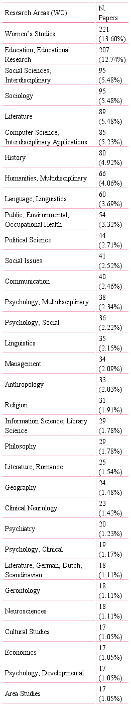 Most areas and categories, as expected, belong to the social sciences and/or humanities, such as sociology, education and educational research – the last two also found by Dehdarirad et al. (2015), in scientific output analysis about women in science –literature, history, linguistics, communication, information science and library science, philosophy, anthropology, etc. Others have aspects from the medical sciences and the social sciences, such as women’s studies, psychology (social, multidisciplinary, developmental), gerontology and public, environmental/occupational health.