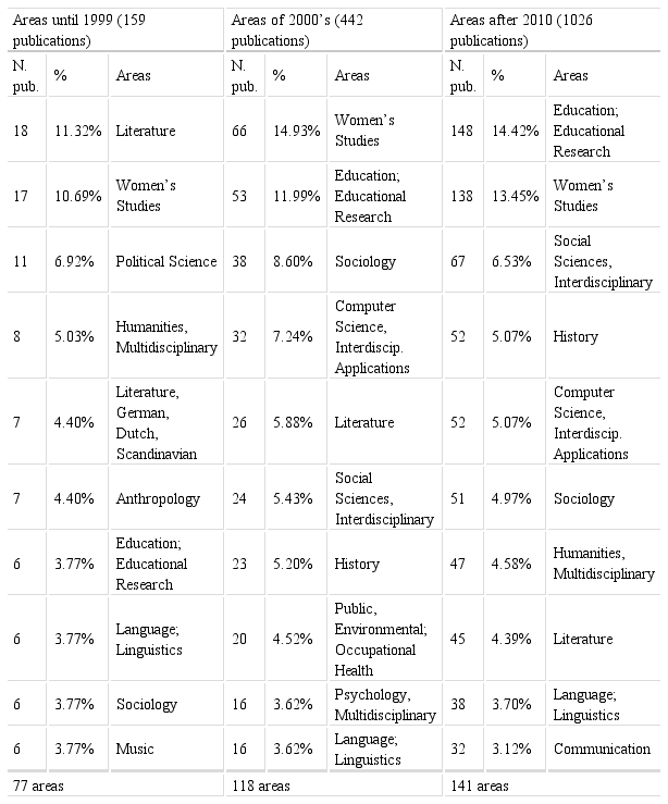 The diversity (besides the dispersion) was also found in the research areas that publish documents self-named gender studies and its interdisciplinarity increased over the years. Areas that appear in the first until the last years of the research are related to humanities and social sciences issues (literature, women's studies, education/ educational research, sociology and language/linguistics) but in the total amount, there’s high frequency of researches in the medical areas, including clinical subjects, and in management and technology areas, like management and computer sciences, respectively.
