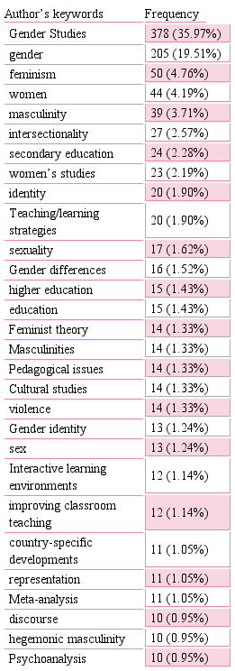 The term feminism itself increases its frequency among the keywords. While before the year of 1999 the term shows up in only three keywords, with one occurrence each (feminism, feminist and feminist and gender studies, with a total of 1.89% of occurrences), in the 2000’s the term alone (feminism) shows up in 3.14% of the papers, and in new terms, like transnational feminism and poststructuralist feminism. After 2010 the isolated term has an increased frequency (3.49% of publications) and many other related terms are found, such as: feminist theory, post-feminism, black feminism,feminist criticism, feminist epistemology, feminist literary studies, feminist pedagogies, feminist debate, feminist translation theory,feminist research, feminist history, Feminist Philosophy, etc.