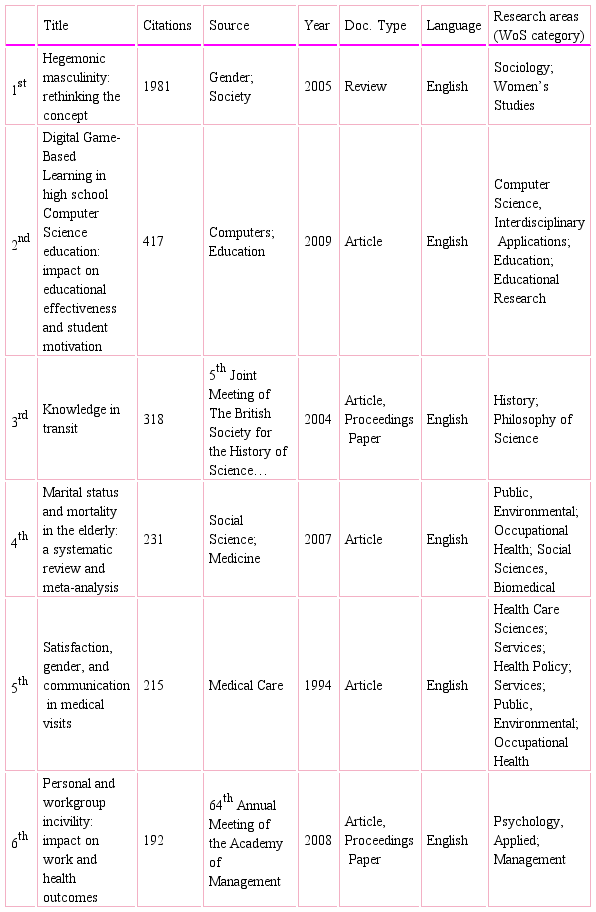 From the chart, the importance of including proceedings indexes in this study is seen, since two among the six most cited works are proceedings papers (republished later as journals articles, according to their information at WoS). Besides, the chart also previews the publications thematic ascertained in the specific analysis. It is especially interesting to notice that the most cited paper include output from areas not usually covered in analysis related to science and gender studies (together, in researches that analyze the feminine participation in certain scientific areas, or qualitative/quantitative researches that analyze the output focused in gender studies from a certain knowledge field) – as in the cases of computer sciences (second most cited), health areas (fourth and fifth) and management (sixth publication).
