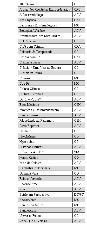 Após verificação, foi elaborada uma lista com os blogues científicos em língua portuguesa encontrados indexados na Altmetric e que contribuem para os indicadores ao citar artigos científicos com identificadores persistentes em suas postagens.