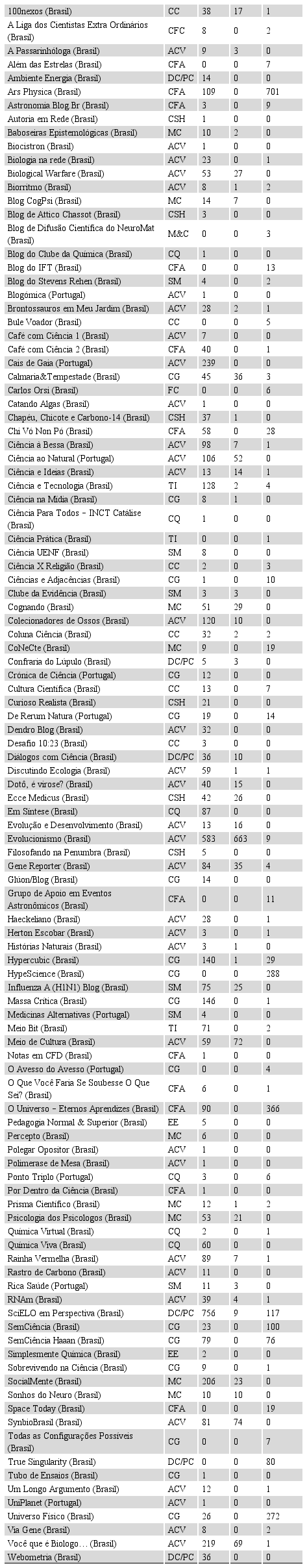 Methods: Starting from the list of blogs registered in the Scientific Blog Ring (Anel de Blogues Científicos - ABC) portal, Google searches were made in order to identify blogs in Portuguese that cite in their posts articles with persistent identifiers such as DOI, PMID or ArXiv, or that integrate the Research Blogging initiative that links posts with research citations in academic journals.