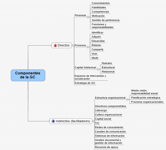 Heisig, Mertins y Vorbeck (2000), establecen los seis ámbitos que determinan las dimensiones del éxito de la GC: sistema de dirección, cultura organizacional, gestión del personal, organización por procesos, tecnologías de la información y control. Bhatt (2000) señala como componentes identificativos y clave de este tipo de gestión a las personas, los procesos y las tecnologías. Según Mentzas et al. (2003), los cuatro componentes de la infraestructura de la GC son: estrategia, estructura, sistemas y procesos. Además de tenerse en cuenta la comunicación (WOLFE, 2016).