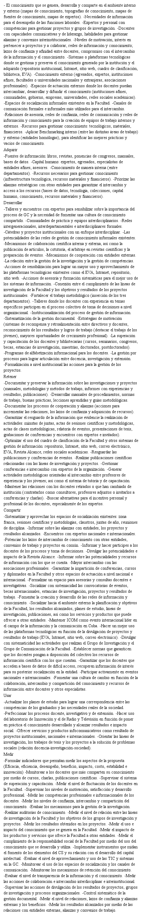 En el diagnóstico se comprobó que se realizan acciones de GC pero de una manera informal y sin sistematización, lo que corrobora la necesidad de la institucionalización de dicho proceso como apoyo al logro de sus objetivos estratégicos y al desarrollo de su capital intelectual. De manera general, los elementos señalados por los docentes permitieron determinar que se reconoce la importancia del proceso, además de la necesidad de aprovechar los espacios de socialización, las tecnologías y los canales de comunicación en función del desarrollo del conocimiento a nível organizacional y por medio de las relaciones con otras entidades.