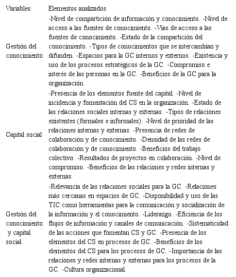 Para el desarrollo de la investigación, las variables objeto de estudio se analizaron a partir de los elementos identificados y que covergen en los estudios teóricos abordados anteriormente.