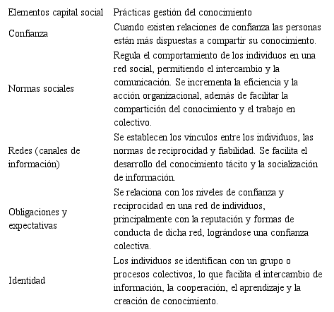 Relacionado con el intercambio de recursos informacionales y conocimiento, el capital social (CS) juega un rol mediador en el proceso estratégico de creación y compartición del conocimiento. El CS consiste en las fuertes relaciones sociales existentes en la entidad, basadas en la confianza, valores y normas, que posibilitan el acceso a los recursos y la colaboración, entre otros elementos que identifican su presencia en las organizaciones; de ahí su estrecha relación con la gestión del conocimiento (GC).