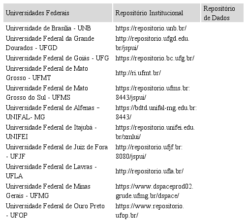 Em relação às Universidades da Região Centro-Oeste, tem-se os repositórios institucionais e de dados, especificados no Quadro 3: