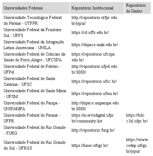 No que se refere às Universidades da Região Sul, tem-se os repositórios institucionais e de dados, especificados no Quadro 5: