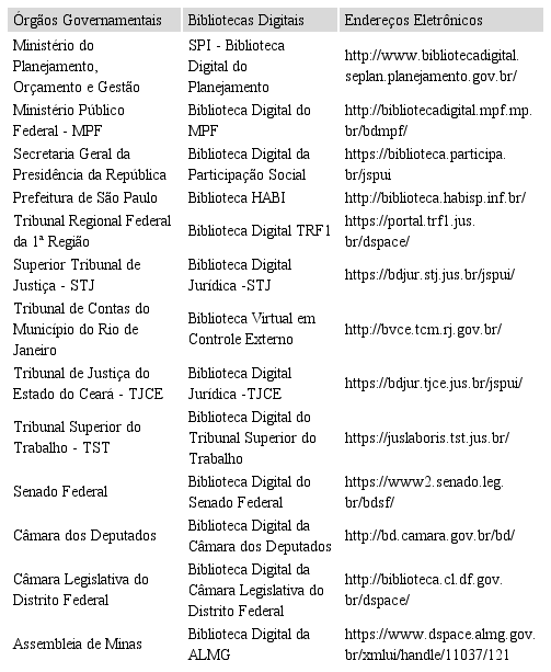 Macêdo, Shintaku e Brito (2015, p. 130), expõem que bibliotecas digitais são cada vez mais comuns e desenvolvidas por agências governamentais, para depósito e compartilhamento de documentação técnica de seus colaboradores. Nesse sentido, os referidos autores identificaram treze bibliotecas digitais ligadas diretamente a órgãos governamentais no Brasil, sendo quatro bibliotecas do poder executivo, cinco do judiciário e quatro dos poderes legislativo, conforme apresentado no Quadro 6: