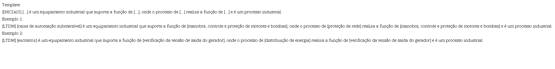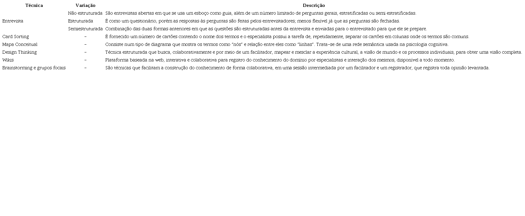 Para direcionar o momento da entrevista e facilitar o registro do conhecimento, gerou-se um formulário usado pelos especialistas para definir termos. Desta maneira, foi possível avaliar e comparar as perspectivas individuais. Junto à terceira etapa, o conhecimento começou a ser formalizado para permitir a validação da AC realizada na quarta etapa. A formalização não é objeto desse artigo, mas para melhor compreensão apresentam-se o template utilizado e exemplos do estágio semiformal (Quadro 2).