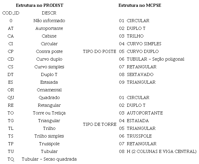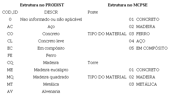 A extração de conhecimento por meio das entrevistas trouxe riqueza de detalhes que permitiu identificar esses problemas em documentos oficiais. Em certos casos, a reflexão gerada na AC culminou na identificação de diferenças entre o MCPSE e a realidade, além de diferenças terminológicas regionais. Outros equívocos foram identificados quando se constatou que códigos identificadores entre dois documentos emitidos pela ANEEL eram usados de forma diferente para uma mesma entidade. Por exemplo, os tipos de estrutura - poste e torre - estão presentes em dois documentos regulatórios, o PRODIST e o MCPSE (Quadro 4), com diferentes códigos para tipos de materiais constituintes (Quadro 5).