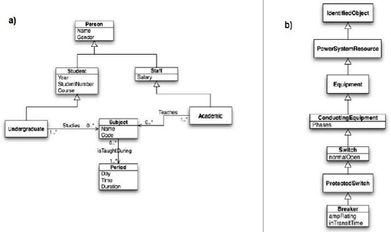 Na Figura 1, o exemplo (a) contém duas especializações para a classe “Person”: “Student” e “Staff”. As subclasses “Student” e “Staff”, como representadas, definem dois tipos de pessoas: estudantes e funcionários. Essa representação causa ambiguidade semântica: i) as subclasses são, na verdade, papéis exercidos pelas pessoas e não tipos de pessoas. Seria adequada uma representação de “pessoas no papel de estudantes” e “pessoas no papel de staff”; ii) também é inadequada a apresentação das classes como irmãs, no mesmo nível hierárquico, como subclasses da classe “Person”. No exemplo (b) da Figura 4, o erro reside na propriedade utilizada para especificação de um novo tipo de equipamento, como se pode observar na generalização “ProtectedSwitch” derivada da classe “Switch”. A propriedade “protected” não é suficiente para trazer a existência uma nova entidade.