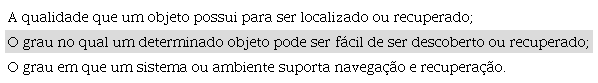 As pesquisas em encontrabilidade da informação advêm dos contributos de Morville (2005) sobre findability. Ilustramos, segundo Morville (2005), as definições de findability no Quadro 1.