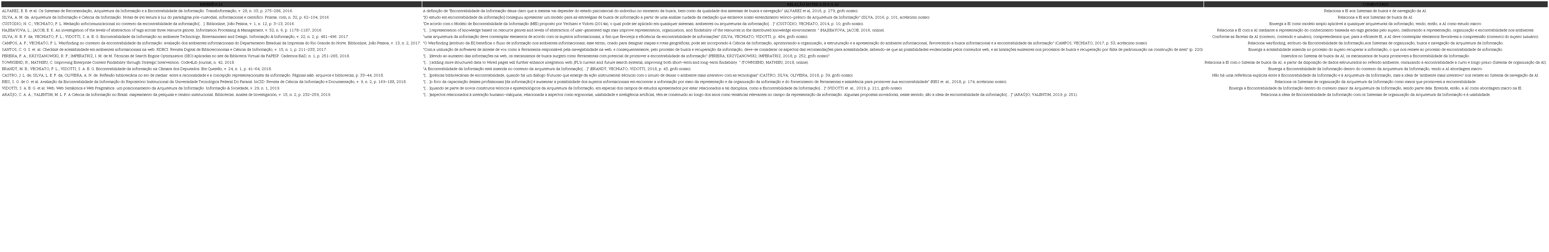 Esta seção estrutura parte do polo morfológico. Ilustramos no Quadro 2 os resultados do processo de pesquisa. Nele, recortamos citações que dialogam diretamente e/ou conceitualmente a Encontrabilidade da Informação com a Arquitetura da Informação. Grifamos termos, palavras e trechos relevantes para o entendimento da relação teórica e realizamos comentários mediante as citações retiradas dos artigos indicados na aba das referências no Quadro 2.